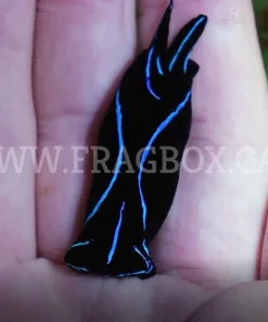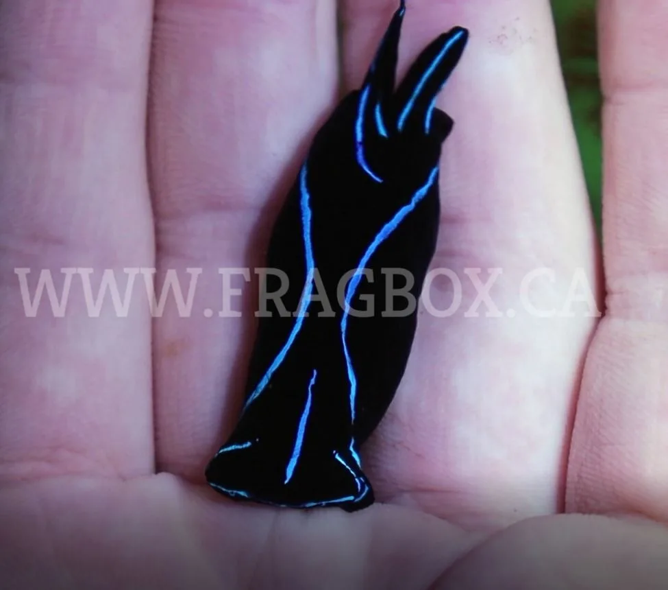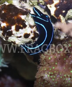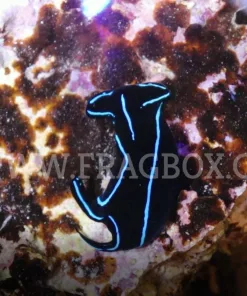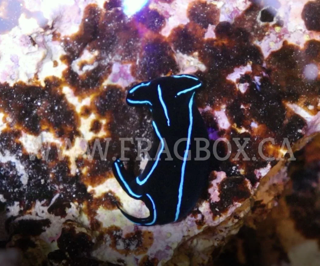 The Blue Velvet Nudibranch, or Blue Velvet Sea Slug, has a deep black body with trademark blue outlining. It has two “tails” at the end of its body with one always longer than the other and a somewhat hammer shaped head. It is a stunning, although somewhat difficult to keep, member of the Cephalaspidea order.
