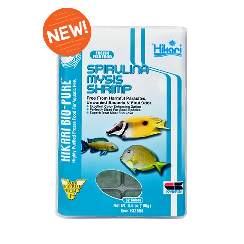 Hikari Bio-Pure Frozen Spirulina Mysis Shrimp are a top of the line treat designed specifically for a wide variety of freshwater and marine fish such as cichlids, angels, triggerfish, wrasses, seahorses and more. The frozen cubes contain live mysis shrimp that have been harvested at their nutritional peak to provide your fancy fish with the highest levels of vitamins, nutrients and natural fatty acids possible. Additionally, these cubes have been gut-loaded with bio-encapsulated multi-vitamins and enhanced with spirulina to encourages proper physical development and vibrant coloration. The easily digestible cubes are great for herbivorous fish and have gone through a rigorous multi-step cleaning process to ensure they are completely free of harmful parasites, bacteria or foul odors. The frozen treat locks in all valuable nutrients with an easy “no touch” packaging that makes feeding your aquatic pets easy and hassle free! Comes with 32 cubes.