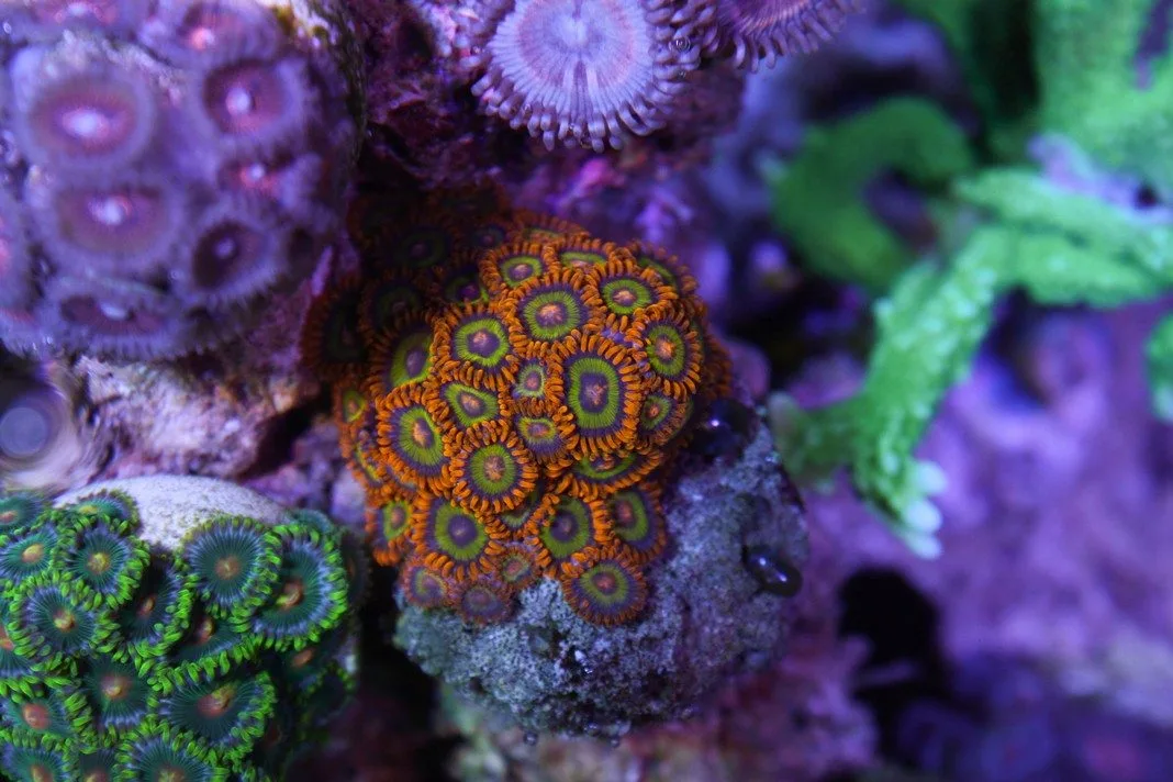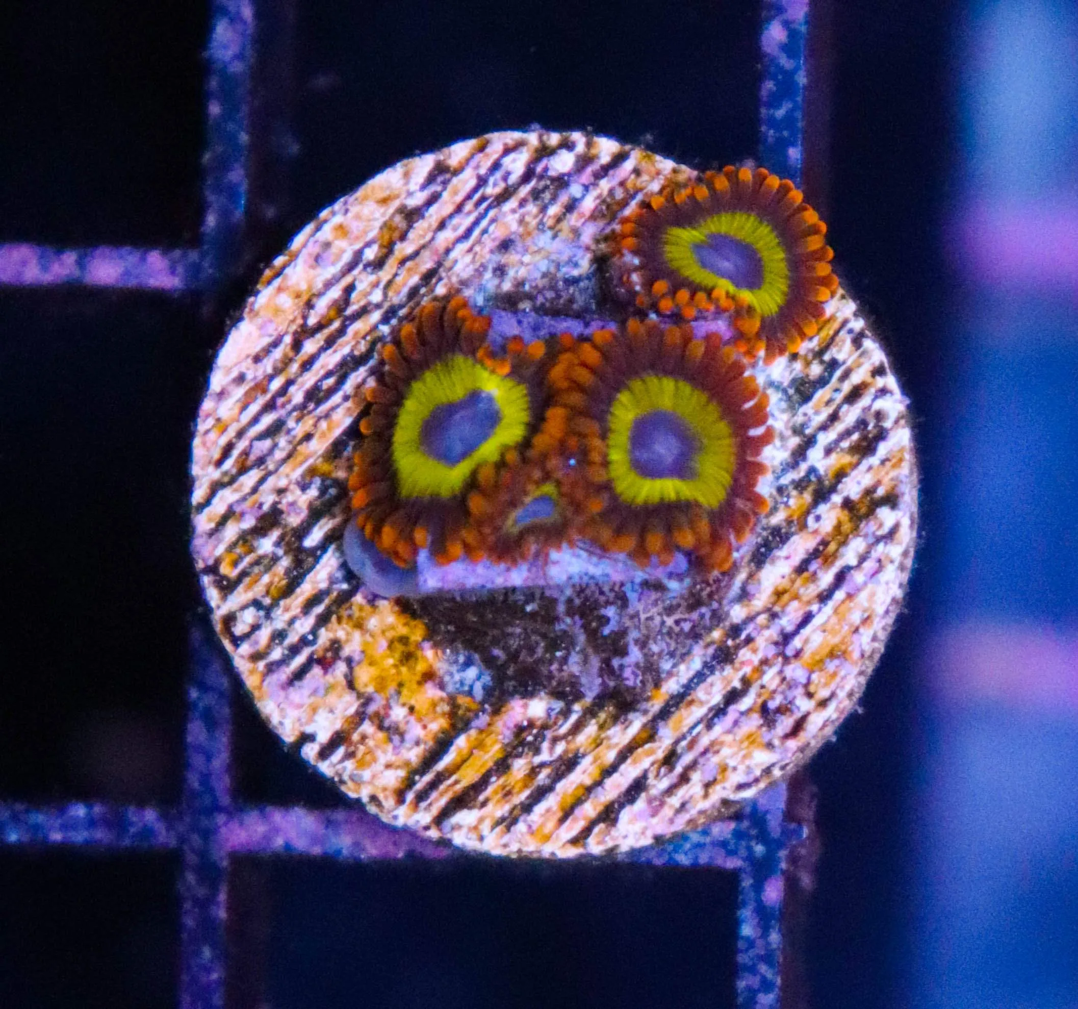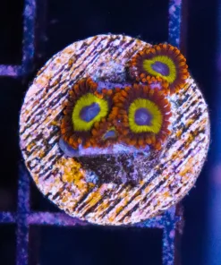 The classic Fruit Loops Zoanthids! Unmistakable, bright and truly amazing. The heads are quite small but they are some of the coolest zoas around. These zoas originally came all the way from Japan. In terms of zoa size they are significantly smaller than most zoas but they grow rapidly turning rock work and surfaces into the most amazing coral. They have a blue mouth, yellow ring and orange skirt that really makes the fruit loops zoa stand out from all other zoanthids.