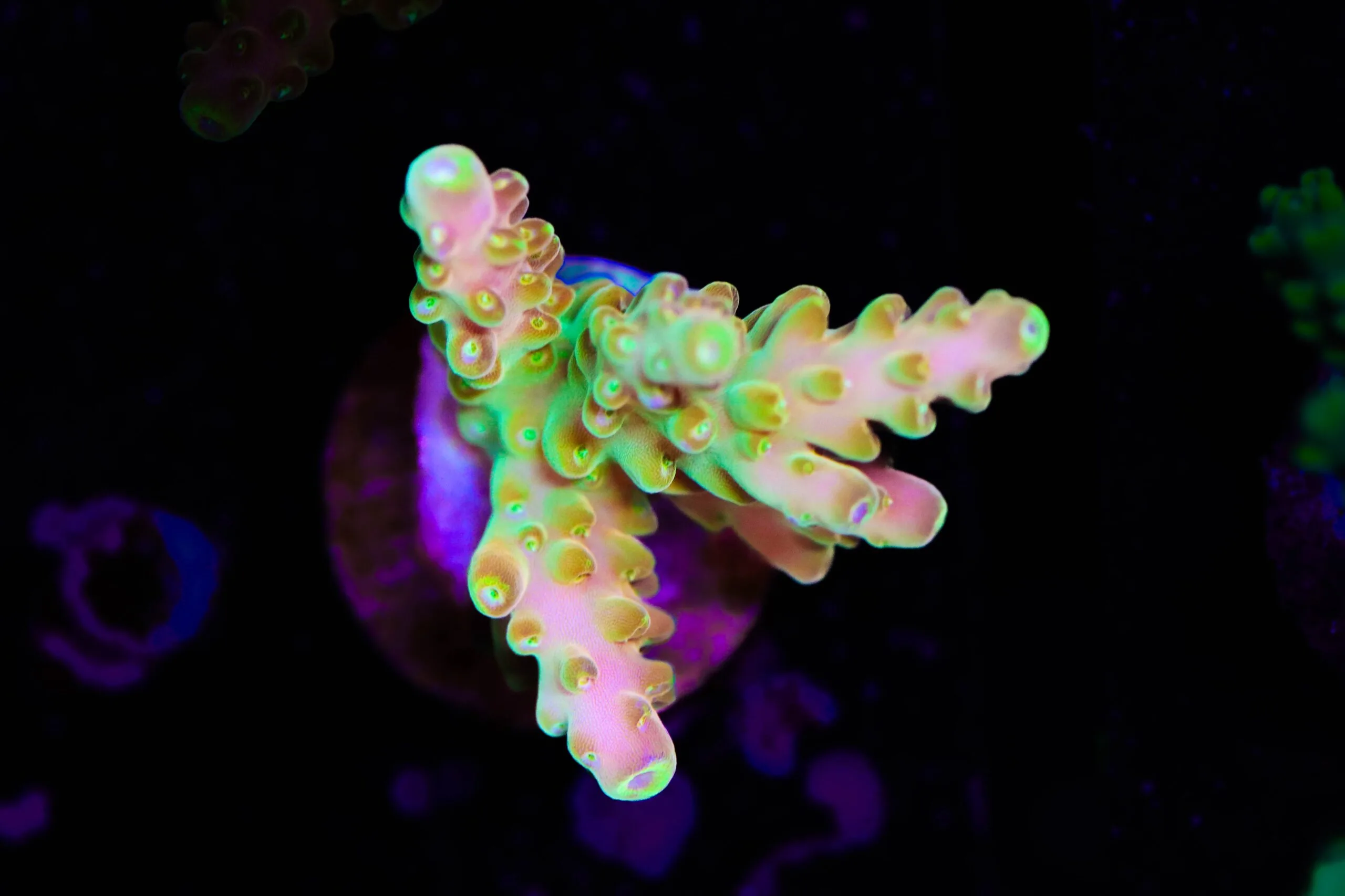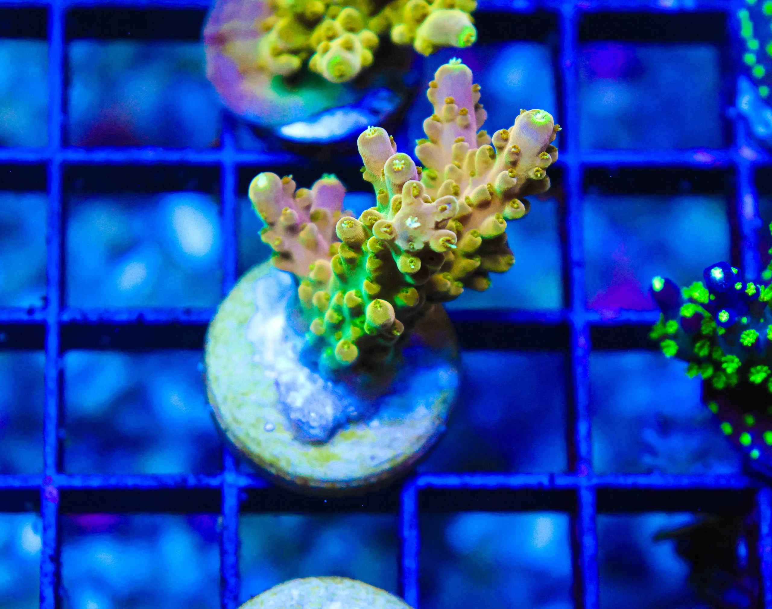 It offers stunning aesthetic appeal and it unlike most other acorpora corals. This one has a mustard yellow color we don’t find this color tone in other species. It truly stands out from the other acropora we offer.