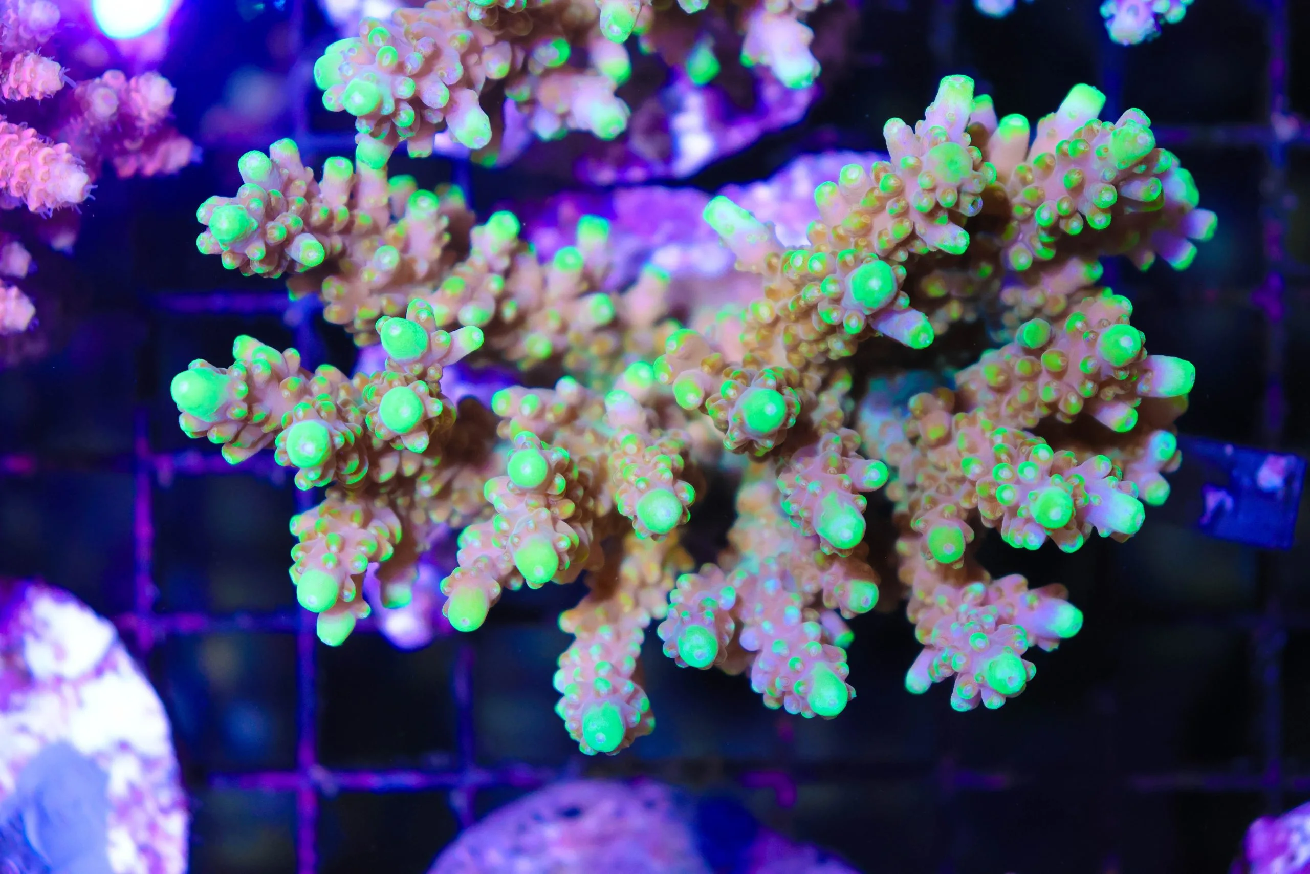Acropora rosaria is found in the Indo-Pacific region, occurring on shallow reef crests and slopes. This variety is maricultured, in coral farms in the ocean in Bali, Indonesia. This a coral that thrives in high light condition, at Fragbox we keep under par levels of 300-400