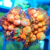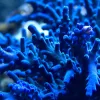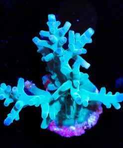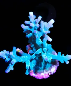 The Hawkins Blue Echinata Acropora is a bottle brush coral originally aquacultured in North America by ORA. It has short turquoise branches and bright blue polyps and looks particularly stunning under intense lighting. It was originally brought to North America from Germany in 2006 and has been steadily increasing in popularity ever since. It grows by sprouting new branches from the central stalk as well as by encrusting the rockwork around its base where new central stalks will eventually form.