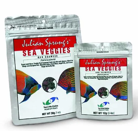 Julian Sprung’s Sea Veggies- Red Seaweed contains dried Palmaria palmata. Ideal for herbivorous marine fishes such as Tangs and Surgeonfish, Moorish Idols, Parrotfish, Angelfish, and large Butterflyfish.