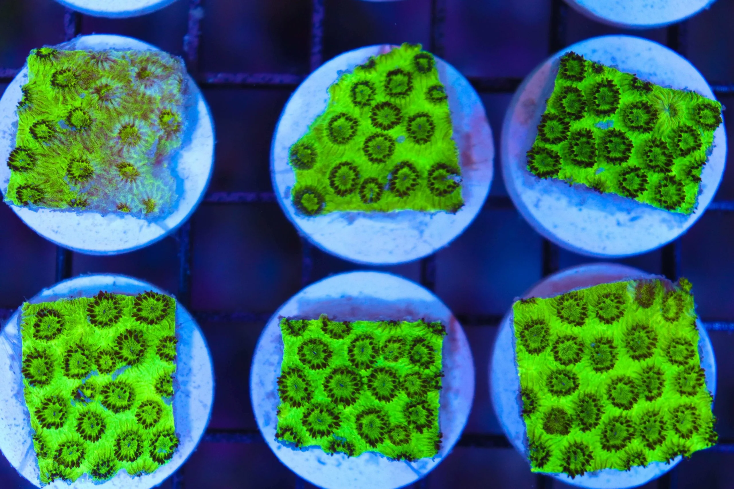 Cyphastrea corals come in a wide variety of colour patterns but all have a single colour encrusting base with contrasting coloured polyps. The different colour morphs of Cyphastrea available include such names as Meteor Shower, Bling Bling and Kermit the Frog. The Meteor Shower morph is generally regarded as the first widely available variation in the saltwater hobby.