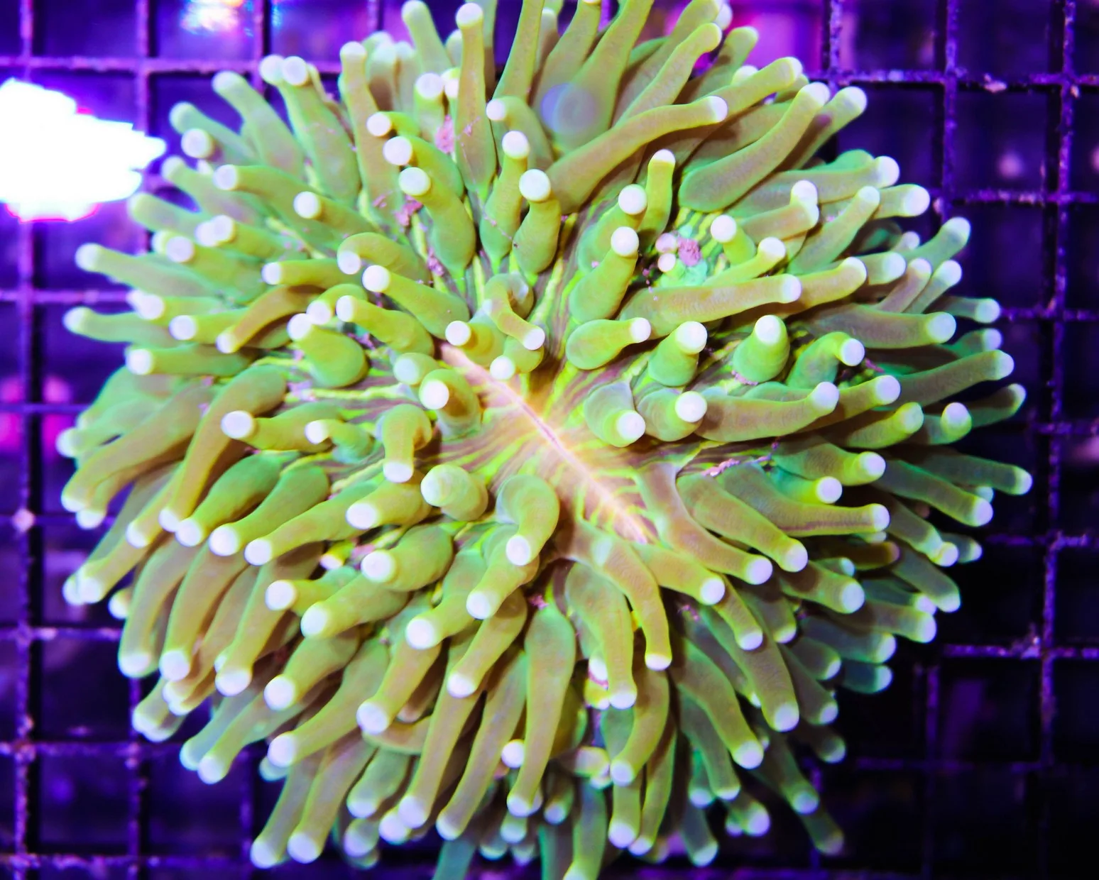 Also known as a Heliofungia Plate or a Disc Coral, the Long Tentacle Plate Coral is a solitary LPS that grows as a single specimen and does not form colonies. It’s scientific name comes from the words Sun “helio” and Mushroom “fungia”. It is found in a variety of colours including red, green and tan. The tentacles sometimes also have contrasting white tips. With its tentacles extended it has the appearance of an anemone. It grows by slowly expanding the diameter of its stony skeleton, with the flesh growing over the new skeleton.