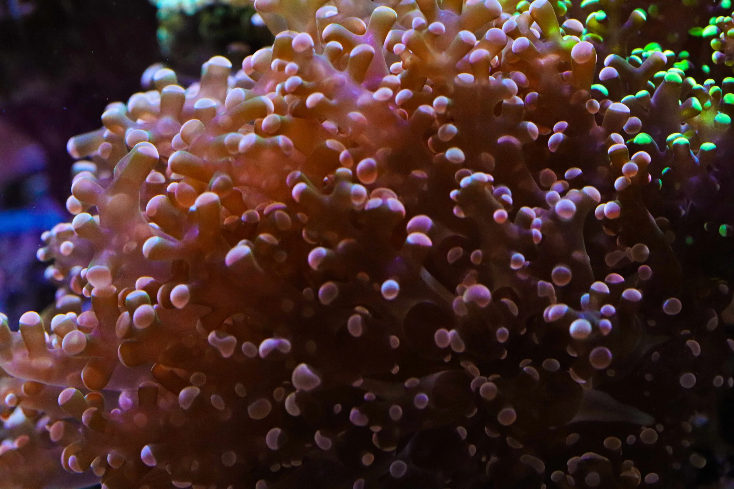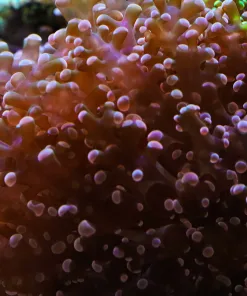 They come in a wide variety of colour combinations with green and purple being the most common and orange and gold less widely available. Sometimes a single specimen will have two colours of polyps and these are often known as “Splatter Frogspawns”. Branching Frogspawn grow through either the splitting of one head into two or, less commonly, new branches sprouting from the central stalk.