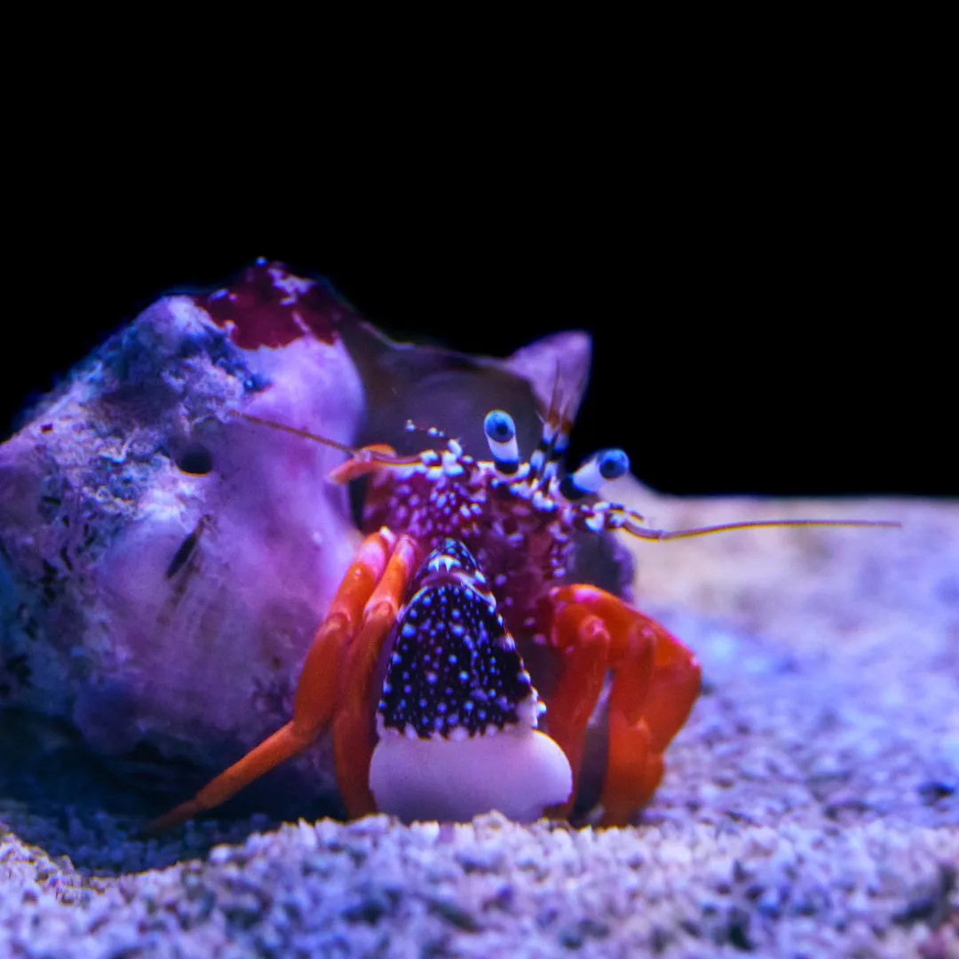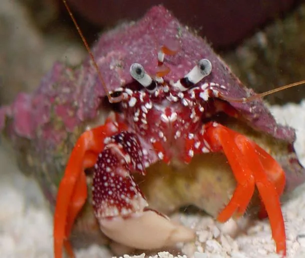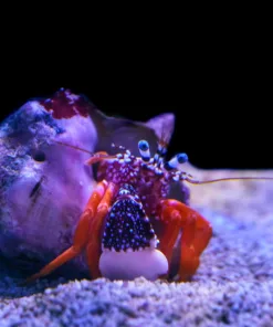 The Polkadot Hermit Crab, Phimochirus operculatus, is a scavenging invertebrate. A common CUC member, the Polkadot hermit consumes excess food, detritus and algaes. This hermit is considered to be a less aggressive species of hermit crab thus making it a better reef inhabitant. As with all hermits, it is best to have extra shells hidden in the tank so they do not compete with other hermits and snails for a new shell after they molt.