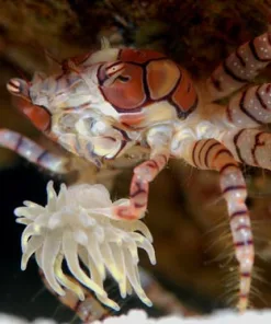 The pom pom crab is classified as an omnivore but its diet generally consists of meaty foods that it mops up using its two anemones. It also will use its anemones to filter zooplankton out of the water column.