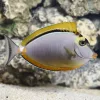 The Purple Tang is considered by many to be one of the most sought after fish in the reefing hobby. This beautiful fish has a purple to blue coloured body with a yellow tail and yellow accents on its pectoral fins. It has a classic tang shape with an oval body, relatively small fins and a protruding mouth that it uses to graze on algae. Its colour will often darken as it matures. This is a fairly large fish, reaching a maximum size of about 10”. They are generally peaceful, but can be aggressive towards other tangs, especially other Purple Tangs.