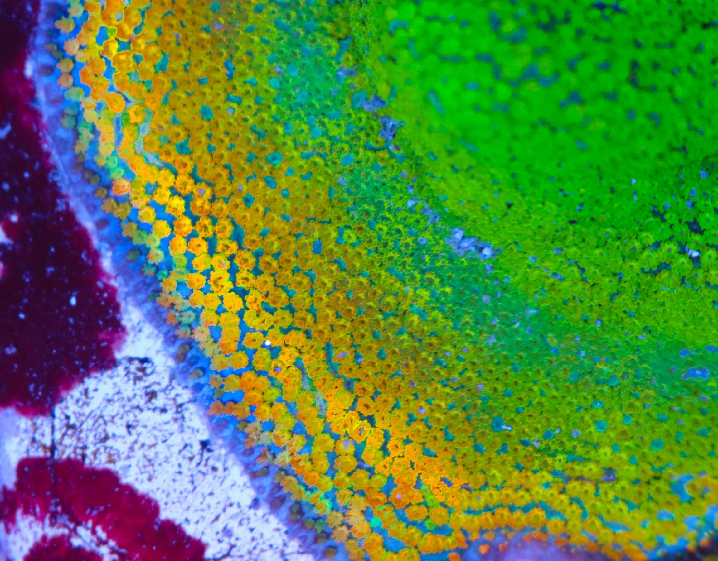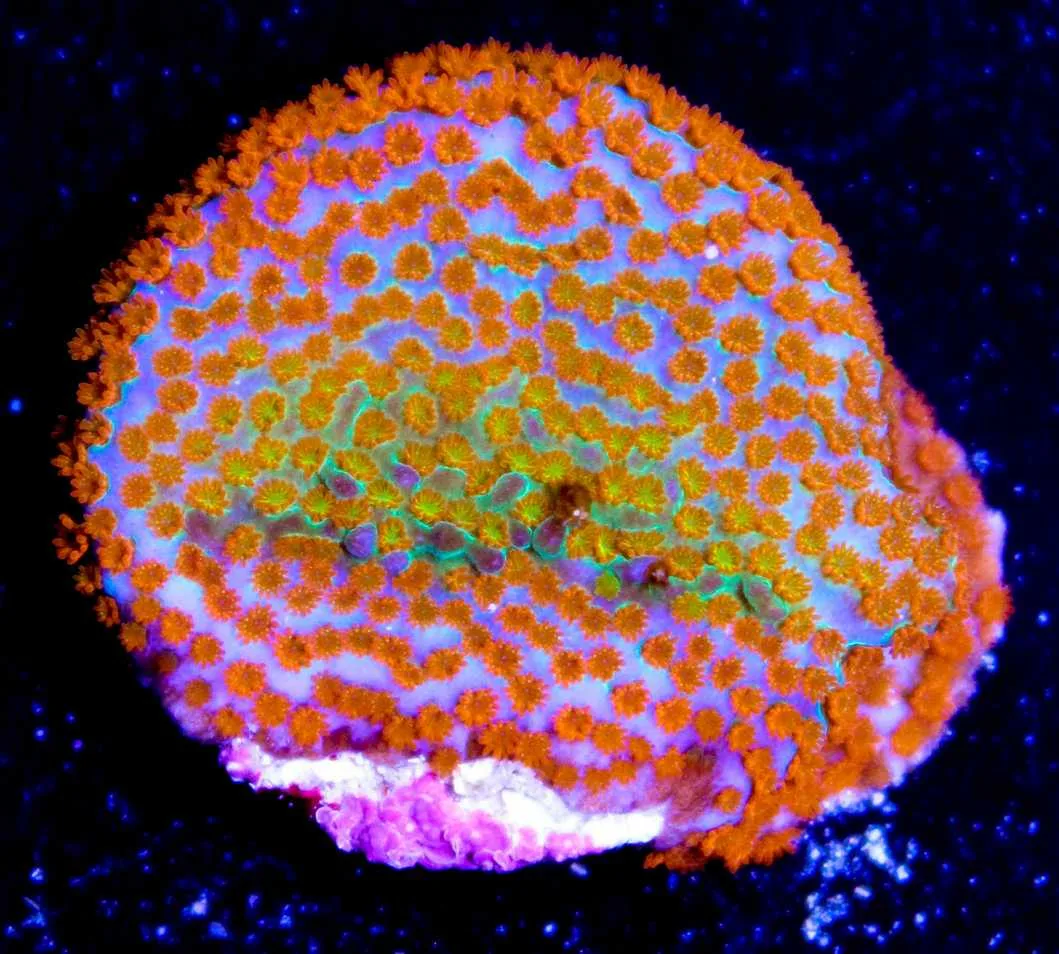 One of the most colorful of all the encrusting montipora species, the classical rainbow montipora. This coral has been in our collection more many years because its easy to grow, color and frag. It is and easy to keep montipora species. Its name is derived from its color and it can show up to 4 distinct colors making it simply unlike any other type of montipora. It is simply unmistakable.