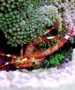 The red squat lobster can be found in the shallow coral reefs of Indonesia. They live among the live rock and coral and can sometimes be found as hitchhikers on uncured live rock. They often live among Crinoid feather sea stars, which they use for camouflage as well as for sustenance by stealing their food. Fortunately, they do not require these sea stars to thrive in captivity. Due to their small size and somewhat timid nature, they prefer an aquascape with ample live rock with many crevices and small caves. Once they become comfortable in their surroundings they will be seen more actively in the tank.