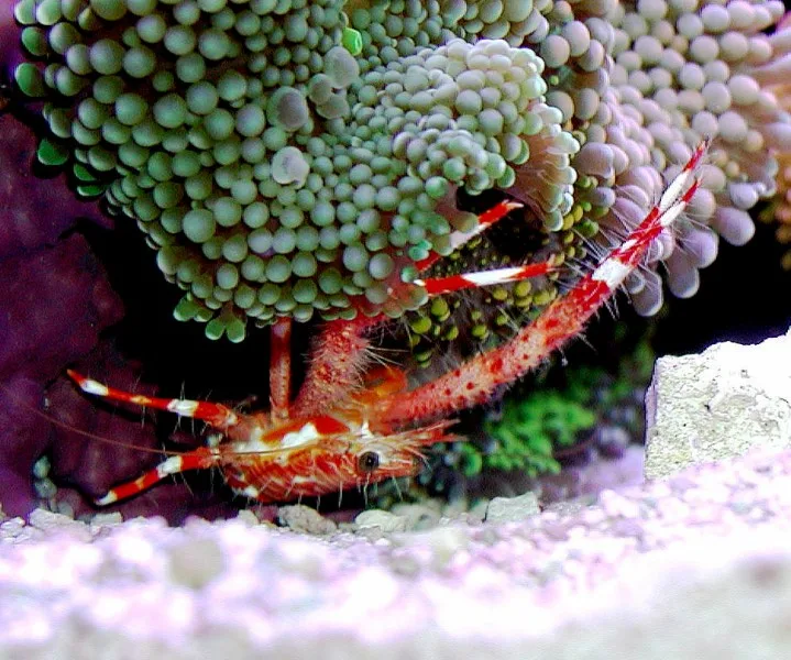 This tiny creature makes an interesting addition to a home aquarium as they are both filter feeders and opportunistic scavengers. Their red colouration also adds a welcome splash of colour to any tank. Like other carnivorous scavengers, they can help rid the tank of meaty leftover foods through their foraging. They can also be spot fed plankton and this is, in fact, recommended. They will also eat chopped squid or other meaty foods. Despite its small size the red squat lobster can be aggressive towards others of its own species so unless a hobbyist can obtain a mated pair it is recommended they be kept singly, except in very large tanks where each one can have its own territory. Like most invertebrates they are not tolerant of copper based medications. The red squat lobster, with its bright colouration and unique feeding style, makes an interesting addition to any home aquarium.