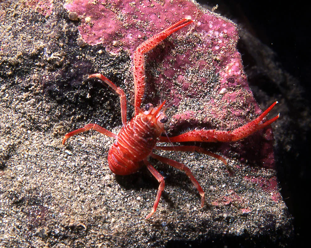 Not actually a lobsters, the red squat lobster is closely related to porcelain crabs. The squat lobster (Galathea balssi) is very discreet, never exploring more than a couple inches away from its shelter. Ususally taking refuge within a cave.