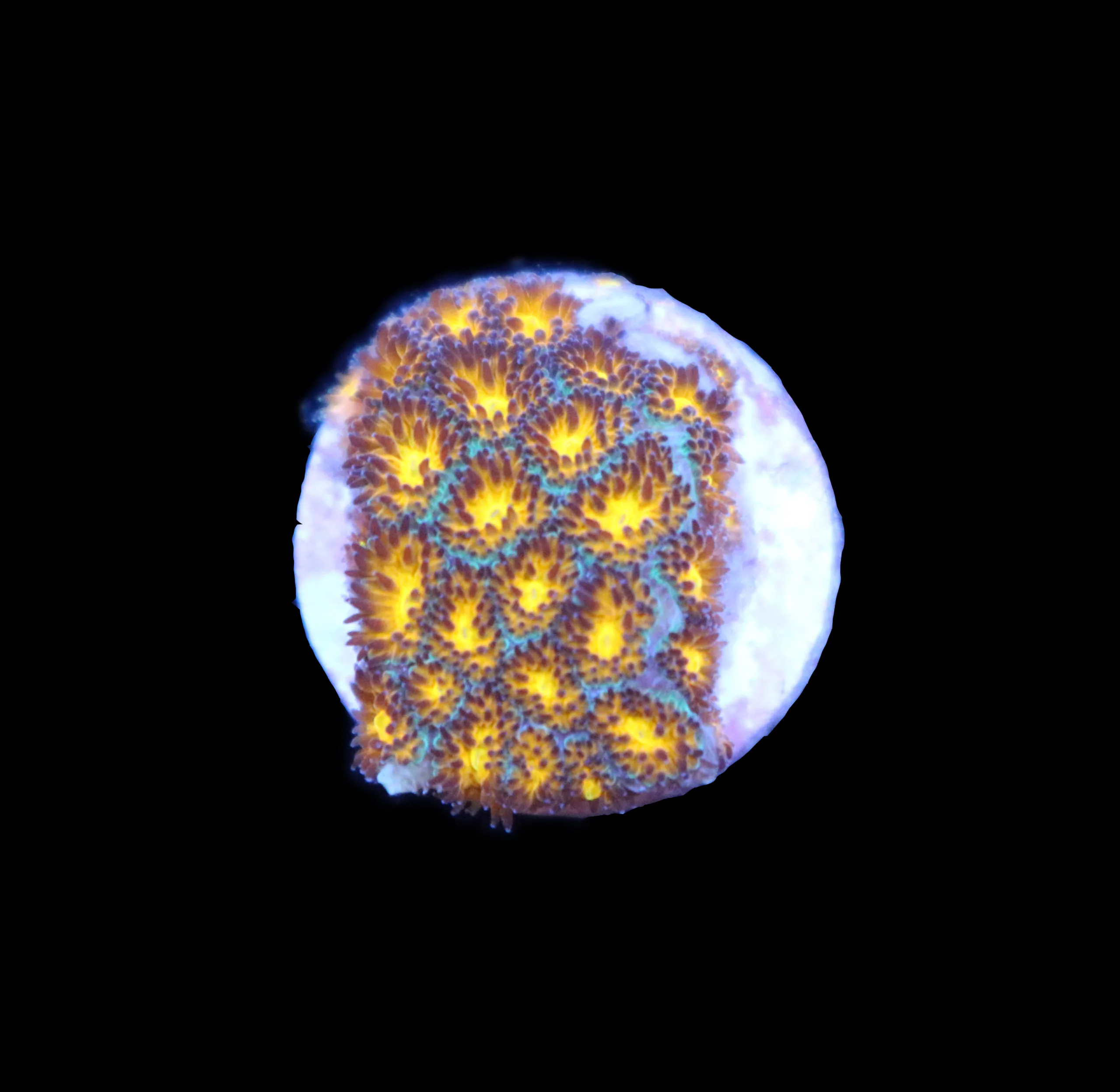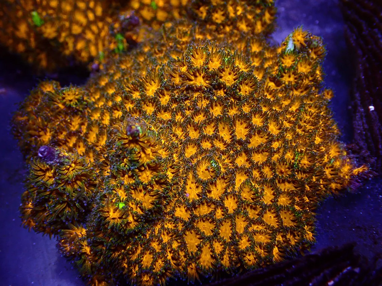 Unlike many other LPS corals, they grow by encrusting over live rock and have small polyps as compared to other LPS corals such as Acans. Wild caught specimens are usually imported from Australia or Indonesia but much of what is available for sale has aquacultured. This has allowed for the proliferation of some of the amazing colour morphs currently available. In the wild they are reef building corals and are found at varying depths, although brighter specimens tend to be found at shallower depths. In a reef tank they should be placed on an exposed piece of rock where they will have room to expand and encrust.