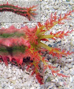 Arguably the most beautiful sea cucumber, this colorful filter feeder needs a minimum of 30 gallons. Rows of pink knobby thorns run lengthwise along its green and yellow body. Like Sea Apples, striking yellow and pink tentacles extend during feeding. Unlike most other sea cucumbers this animal normally stays stationary, when it finds a suitable location in the aquarium with the proper flow.