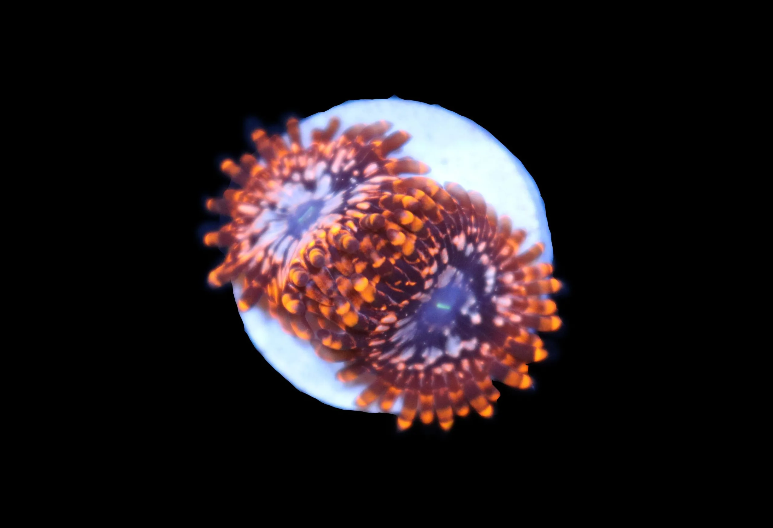 The one and only Utter Chaos Zoanthid. Any serious zoanthid collector simply must have this coral in their collection. There are few zoas that have larger heads and are more unique than utter chaos ! The heads can get the size of nickels and they have a very unique white speckle pattern that is unmistakable. There is simply no other zoa that looks like utter chaos. The outside skirt is frilly and adds nice movement in the current. We have been growing this in our zoanthid farm for many years with success. These zoas are easy to keep and fast growing. They have no sting and will cover just about any surface.