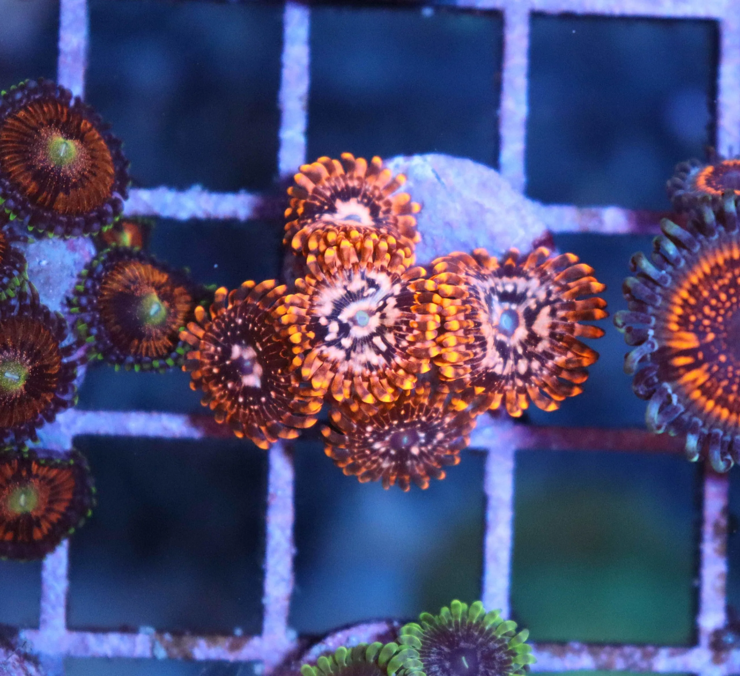 They are Photosynthetic do not need to be feed but do love to eat, we recommend feeding live phyto and reef roids. They do well in a variety of placement in the tank, under lower lights they will stretch and get larger with less color. Under high light they grow close and tight to the rock with smaller heads but much brighter color. They like moderate flow and this helps to keep their underlying tissue free from detritus buildup. We recommend keeping your tank parameters close natural sea water conditions, but zoanthids like these ones can thrive under less than ideal conditions. They will actually grow faster with higher nitrates and phosphate levels so they make an ideal candidate for low maintenance aquariums.