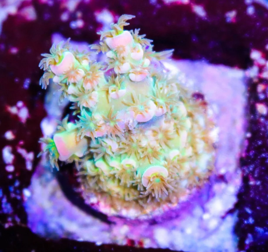 Acropora are considered by many hobbyists to be the pinnacle of reef keeping. They absolutely require a mature tank and stable water parameters but are highly rewarding. While there are countless trade names and colour morphs available one that is instantly recognizable is the Walt Disney Acropora. The colours of this coral are almost impossible to describe. It has a beautiful green base, red corallites, yellow polyps and blue growth tips. While the label “the most beautiful coral in the world” is highly subjective, the Walt Disney Acropora would certainly be on the finalists list. The Walt Disney is an Acropora tenuis so it is a bushy acropora that grows in a branching form. It will also encrust around its base, creating a beautiful carpet around itself.