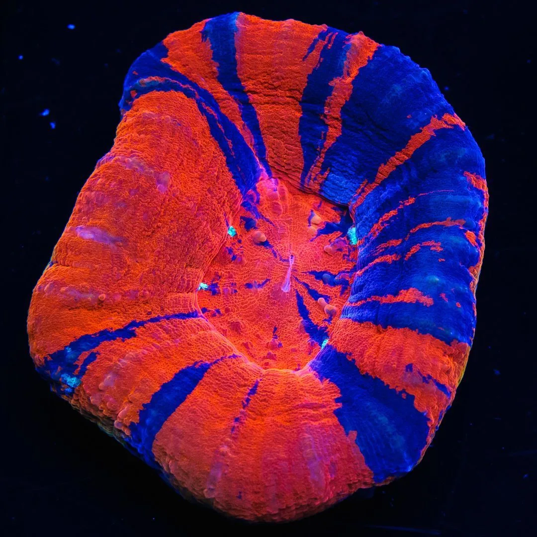 The war paint Scolymia also known as a Scolymia is one of the brightest and eye catching corals you can keep in your aquarium. The War Paint Scolymia gets its name from its amazing deep vibrant blue base wand red marbling pattern throughout the coral body.. This is the striking war paint scoly, unmistakable with any coral or scoly. They are almost always circular in shape and grow to about 3-4” across. They come in a variety of different colors but the most sought after varieties are the warpaint, bleeding apple and master scolies. Scolymia are easy corals to keep and are best kept on the sandbed. It is important to ensure however that they don’t get covered with sand. They do not have any sweeper tentacles and will not harm other corals. Its common for aquarists to group different colored scolies into gardens. Unfortunately, scoly can not be fragged and do not typically reproduce in home aquariums. They are fairly slow growing but will accept almost all meaty foods and coral foods designed for lps corals.